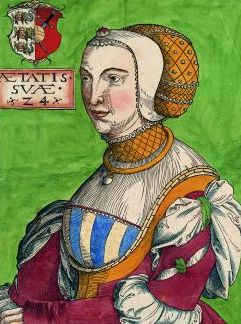 Die Königin der „Wiedertäufer“ war aber Divara von Haarlem. Da die Kleidung genau der aus einer Kupferstichfolge Joseph und Potiphars Weib gleicht, besteht die Möglichkeit, dass es sich um ein Phantasieportrait handelt.[Anm. 2] Die rechte Hälfte des Wappens zeigt die Weltkugel mit Schwertern, das Wappen Jan van Leydens.