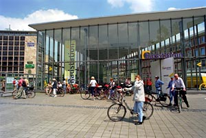 Eine ebenfalls gefährliche Stelle erreicht man direkt nach dem Verlassen des Fahrradparkhauses am Hauptbahnhof. Die nordwärts führende Bahnhofstraße ist zwar bis zu vierspurig, aber für die in diesem Bereich natürlich in großer Anzahl fahrenden Radler gibt es keinen Fahrradstreifen.