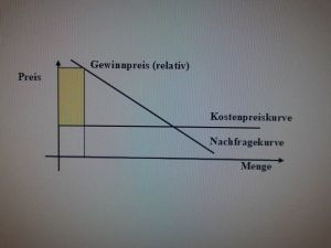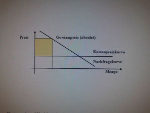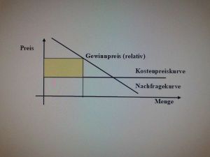 Nach meinen eigenen Überlegungen ist es so, dass es zwei Preise gibt, den reinen Kostenpreis der durch betriebswirtschaftliche Kostenkalkulation entsteht und den Markt- oder Gewinnpreis. Der reine Kostenpreis stellt dabei praktisch einen idealen Grenzfall dar, den Preis, zu dem der Unternehmer gerade noch bereit ist, seine Waren oder Dienste anzubieten. Wenn wir nun eine solche gedachte Kostenkurve, die wir uns vereinfacht absolut flach denken, in unser Preis-Mengen-Diagramm einzeichnen, und die Nachfragekurve darübersetzen, so können wir nun ganz einfach den Markt- oder Gewinnpreis ermitteln. Dies geschieht durch Gewinnkalkulation. Der Markt- oder Gewinnpreis ist dann der Preis, bei dem die Fläche zwischen Nachfragekurve und Kostenkurve ihr Maximum hat. Das ist dann der Fall, wenn die Gewinnfläche genau ein Quadrat bildet, denn dann ist sie maximal: Wir können den ermittelten Preis auch den absoluten Gewinnpreis nennen.