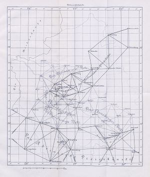 Das rheinische Dreiecksnetz dagegen hatte seinen Referenzpunkt an den astronomisch bestimmten Koordinaten der Bonner Sternwarte. Aufgrund der uneinheitlichen Maße und Orientierung war für die geplante Preußische Neuaufnahme die geodätische Zusammenführung der bestehenden Netze nach einer einheitlichen Metrik erforderlich. Zu diesem Zweck wurden drei trigonometrische Verbindungsnetze geschaffen[Anm. 2]: