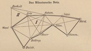 Das Münstersche Netz bestand aus fünf Punkten primärer Ordnung im westlichen Münsterland und Niederrhein, die an die bestehenden Punkte Duisburg - Bottrop - Buer - Stimberg - Kemminghausen (sekundärer Punkt) - Nordick des Dortmunder Netzes angeschlossen waren. Die Punkte waren: