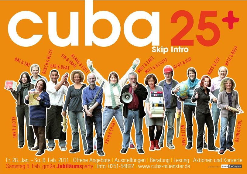 | 20:13, 19. Jan. 2011 | Cuba25.jpg (Datei) | 104 KB | Startseite von www.cuba-muenster.de zum 25. Jubiläum des Einzugs in das Gebäude in der Achtermannstraße (Screenshot vom 19.1.2011). | 1 | |