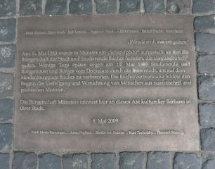 Version vom 10. Juni 2009, 20:32 Uhr von Meschede (Diskussion | Beiträge) (Gedenkplatte auf dem Domplatz (gegenüber dem Fürstenberghaus), die seit dem 6. Mai 2009 an die Vernichtung kultureller Werte durch die Bücherverbrennung in Münster erinnert.)