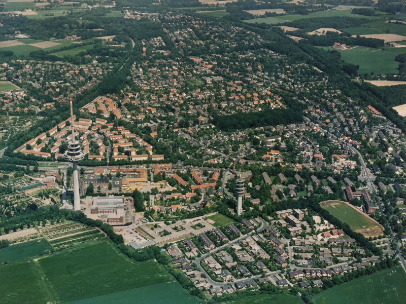 Mauritz-Ost von Süd-Südwest. Mit neuem und altem Fernmeldeturm und Margaretakirche im Vordergrund. Mit freundlicher Genehmigung der Kirchengemeinde Sankt Margareta.